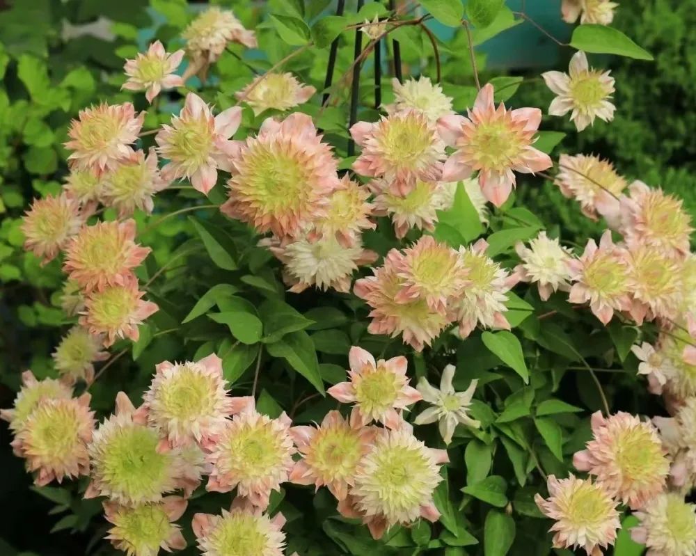 Dahe is a Classic clematis varieties that everyone praises (The plant is about 1.7 m), especially heat and sun resistant, Its special feature lies in its double-petaled flowers, with a flower diameter of 8-12 cm. The middle sepals are sharp and thin when they are not unfolded, and the tips are yellow-green mustard color. As the sepals gradually unfold, they finally become a full ball like peony flowers, showing the shape of "flowers among flowers", full of exotic customs.