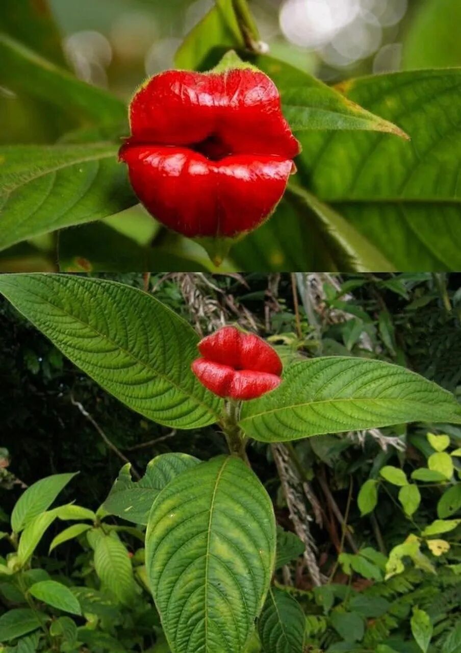 The lip flower is a shrub or small tree. Its bracts are bright red and dazzling, and its shape is very peculiar. It looks like a very attractive lip, and it seems to give you a flaming red lip at any time.