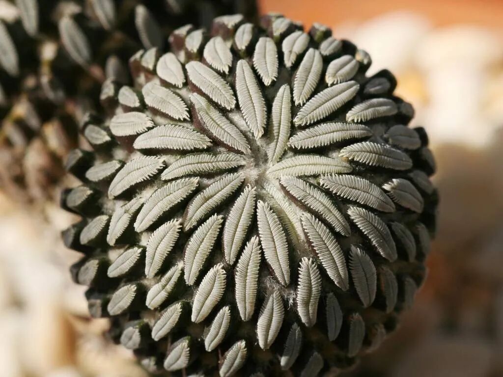The stems are small spherical (5-7 cm in diameter), densely clustered, dark green, and densely covered with white feather-like spines (white long wool hairs on the armpits of wart-like protrusions).
