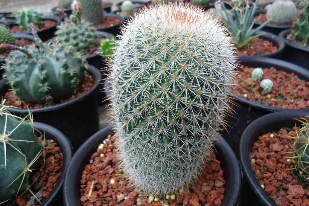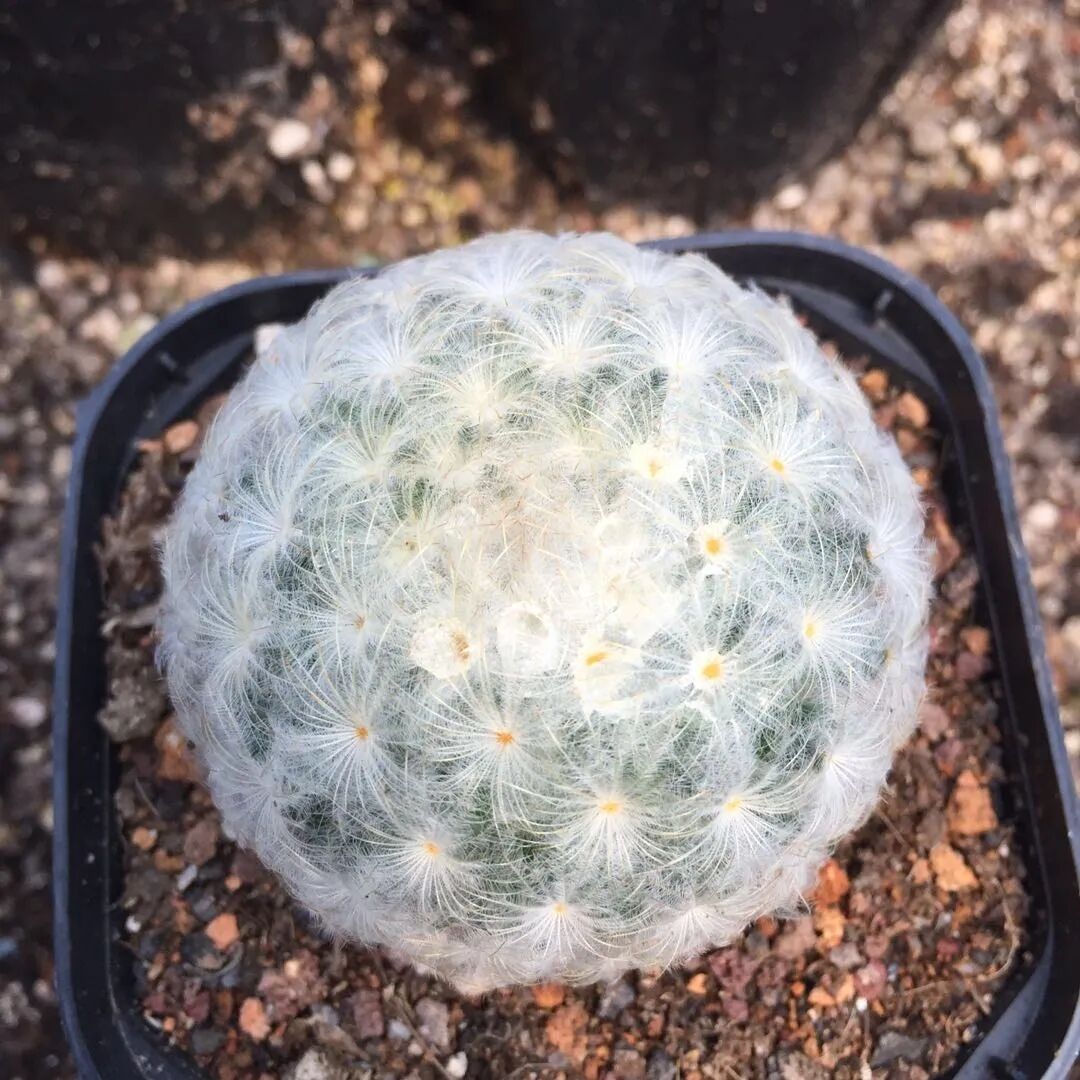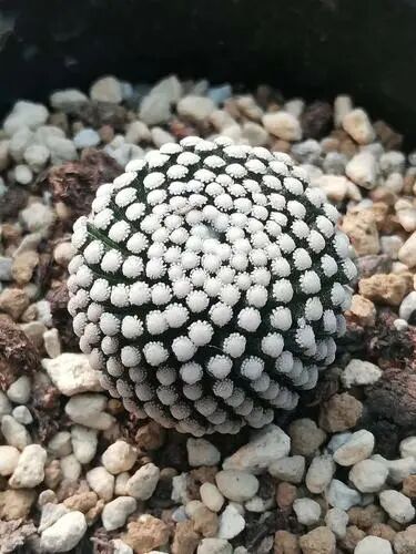 The sphere of Shirakomachi is dark green, and the thorn seats are densely distributed. Each thorn seat has a middle thorn and silver-white or yellow-white brush-shaped secondary thorn.