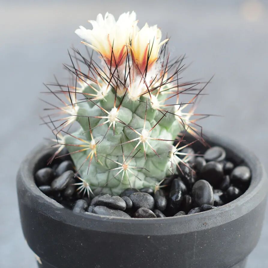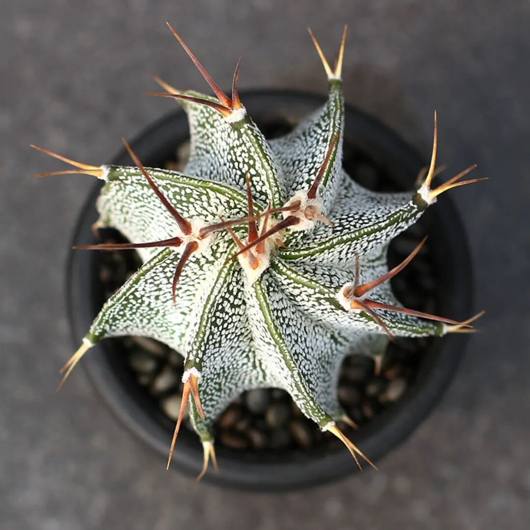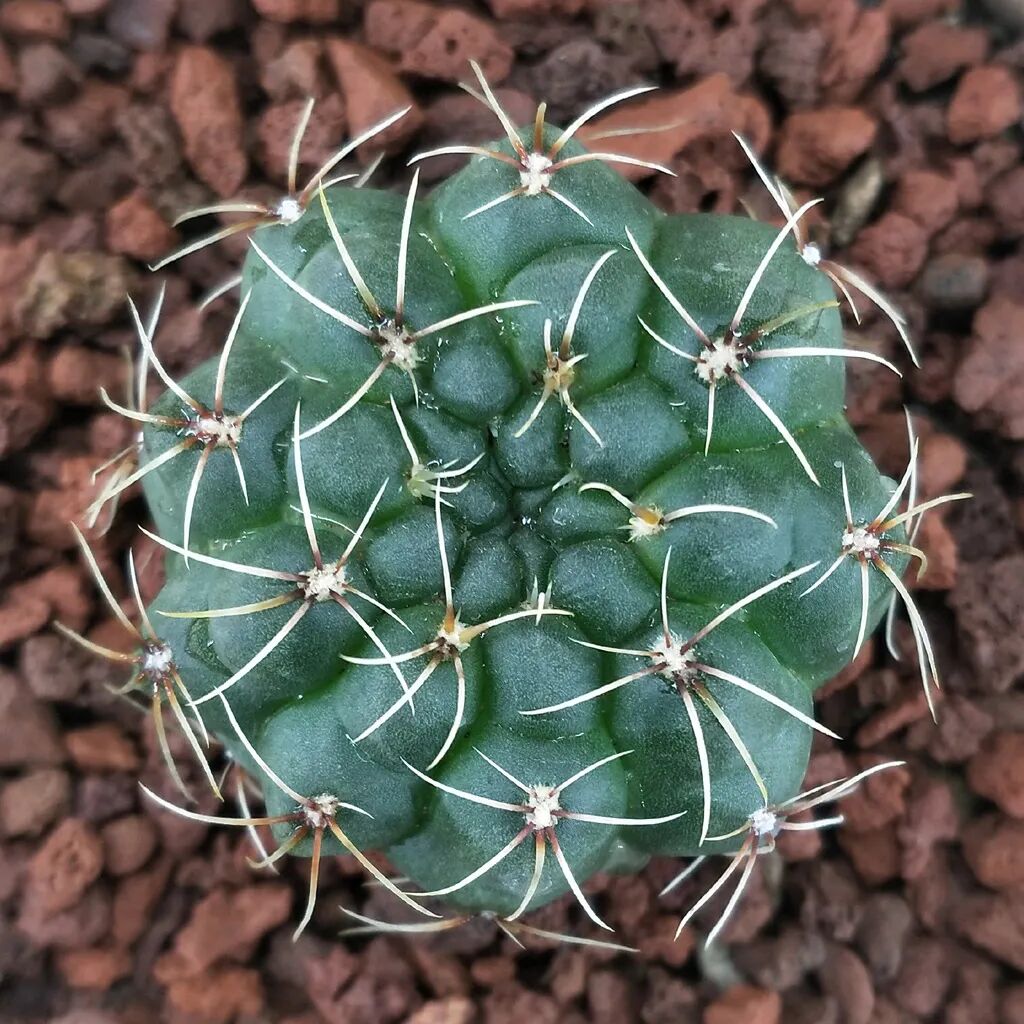 The sphere is round or flat, blue-green or dark green. Each spine seat has 3 central spines (very stout, gray pointed, inward curved) and 8-9 radial small spines.